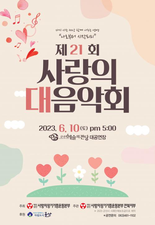 Á¦21ȸ »ç¶ûÀÇ ´ëÀ½¾Çȸ´Â ¿À´Â 10ÀÏ ¿ÀÈÄ 5½Ã ±º»ê¿¹¼úÀÇÀü´ç ´ë°ø¿¬Àå¿¡¼ °³ÃֵǸç Àå±â±âÁõ °ü·Ã À¯°øÀÚ ½Ã»ó°ú È«º¸´ë»ç À§ÃË µîÀÌ ÀÌ·ïÁú ¿¹Á¤ÀÌ´Ù. À½¾Çȸ °ø¿¬Àº ¡®»ý¸í¡¯°ú ¡®³ª´®¡¯À̶ó´Â ÁÖÁ¦·Î ¼º¾Ç(µ¶Ã¢, ÇÕâ)°ú ±â¾Ç, ½Ã ³¶¼Û µîÀ¸·Î ±¸¼ºµÆ´Ù.