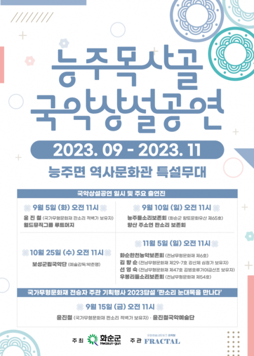 ÆÇ¼Ò¸®·Î´Â À±ÁøÃ¶ ±¹°¡¹«Çü¹®ÈÀç, ±èÇâ¼ø, ¼±¿µ¼÷ Àü³²¹«Çü¹®ÈÀç°¡ °ø¿¬ÇÏ°í ³ó¾ÇÀ¸·Î´Â ȼø±º ÇâÅä¹®ÈÀ¯»êÀÎ ´ÉÁÖµé¼Ò¸®º¸Á¸È¸, Àü³²¹«Çü¹®ÈÀçÀΠȼøÇÑû³ó¾Çº¸Á¸È¸, ¿ìºÀ¸®µé¼Ò¸®º¸Á¸È¸°¡ °ø¿¬À» ÆîÄ£´Ù.