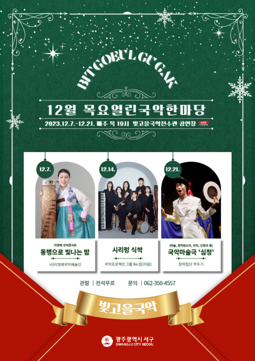 7ÀÏ Ã¹ °ø¿¬Àº ±¤ÁÖ±¤¿ª½Ã ¹«Çü¹®ÈÀç °¡¾ß±Ýº´Ã¢ º¸À¯ÀÚ ÀÌ¿µ¾Ö ¸íÀÎÀÌ À̲ô´Â »ç)ÀÌ¿µ¾Ö±¹¾Ç¿¹¼ú´ÜÀÌ ¡®µ¿ÇàÀÌ ºû³ª´Â ¹ã¡¯À» ¼±º¸ÀδÙ. û¼Ò³â¡¤Ã»³â¡¤½Ã´Ï¾î ¼¼´ë°¡ ÇÔ²² ¸¸µé¾î °¡´Â ±¹¾ÇÄܼƮ·Î, ÆÇ¼Ò¸®ºÎÅÍ °¡¾ß±Ýº´Ã¢, ±¹¾Ç°¡¿ä, ÀÔÁ¦Ã¢, ¹Î¿ä µî ³²µµ ¼Ò¸®ÀÇ ±íÀ̸¦ ´À³¥ ¼ö ÀÖ´Â ´Ù¾çÇÑ ¹«´ë¸¦ ¸¸³ªº¼ ¼ö ÀÖ´Ù.