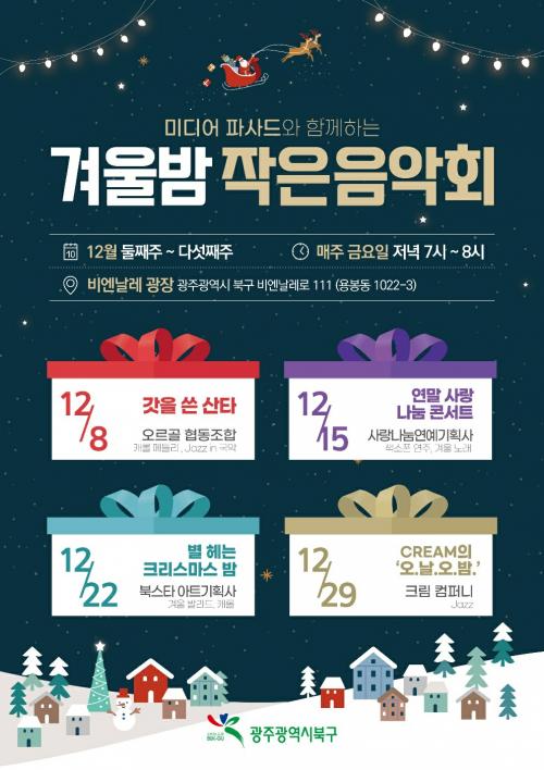°Ü¿ï¹ã ÀÛÀºÀ½¾Çȸ´Â 12¿ùÀ» ¸Â¾Æ ºÏ±¸ÀÇ ¸í¼ÒÀÎ ºñ¿£³¯·¹ ¹Ìµð¾îÆÄ»çµå¿Í ÇÔ²² °Ü¿ïÀ» ÁÖÁ¦·Î ÇÑ À½¾Ç°ø¿¬À» ¸¶·ÃÇÏ¿© ÁֹεéÀÌ ¹Ù»Û ÀÏ»óÀ¸·Î ÁöÄ£ ¸ö°ú ¸¶À½À» ȸº¹ÇÏ°í °¡Á·°ú ÇÔ²²ÇÏ´Â ÇູÇÑ ¿¬¸» Áö¿ª ºÐÀ§±â¸¦ Á¶¼ºÇϰíÀÚ ÃßÁøµÈ´Ù.