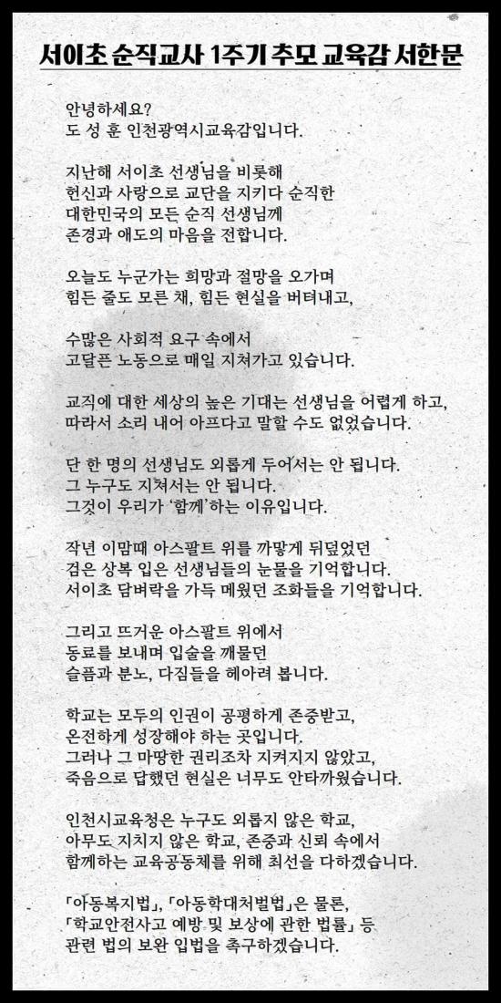 17ÀÏ ¿ÀÀü ÀÎõ½Ã±³À°Ã»¿¡ ¸¶·ÃµÈ Ãß¸ð°ø°£À» ãÀº µµ ±³À°°¨Àº ¡°Ã¼ÇèȰµ¿ µî ±³À°°úÁ¤ ¼Ó¿¡¼ ¹ß»ýÇÑ »ç°í¿¡ ´ëÇØ °íÀdzª Áß´ëÇÑ °ú½ÇÀÌ ¾øÀ» °æ¿ì ±³»ç°¡ ¹ýÀû Ã¥ÀÓÀ¸·ÎºÎÅÍ º¸È£¹ÞÀ» ¼ö ÀÖ´Â ÀåÄ¡¸¦ ¸¶·ÃÇØ¾ß ÇÑ´Ù¡±¸é¼ ¡°¼ÀÌÃÊ ±³»çÀÇ ¾ÈŸ±î¿î Á×À½°ú ±³±ÇÀÌ ¹«³ÊÁö´Â °¡½¿ ¾ÆÇ »ç·ÊµéÀ» Á¢Çϸç, ±³±ÇÀÌ Á¸ÁßµÇÁö ¾ÊÀ¸¸é ¾î¶² ±³À°µµ Á¦´ë·Î ÀÌ·ïÁú ¼ö ¾ø´Ù´Â ¼±»ý´ÔµéÀÇ ¸¶À½¿¡ ±íÀÌ °ø°¨ÇÑ´Ù"°í ¹àÇû´Ù.