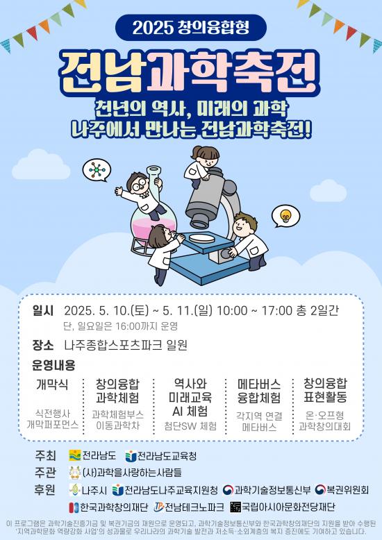 ¿ÃÇØ·Î 27ȸ¸¦ ¸ÂÀÌÇÏ´Â Àü³²°úÇÐÃàÀüÀº ¡®Ãµ³âÀÇ ¿ª»ç, ¹Ì·¡ÀÇ °úÇС¯À» ÁÖÁ¦·Î ¿¸®¸ç, Àü¶ó³²µµ ÃÊµî °úÇб³»ç ´ÜüÀÎ ¡®°úÇÐÀ»»ç¶ûÇϴ»ç¶÷µé¡¯ÀÌ ÁÖ°üÇÑ´Ù. À̹ø ÃàÀü¿¡´Â °úÇÐÀÇ ´ëÁßÈ¿Í 4Â÷ »ê¾÷Çõ¸í ½Ã´ë¿¡ ¹ß¸ÂÃç ÇлýµéÀÌ Áñ±æ ¼ö ÀÖ´Â 110¿© °³ÀÇ ÇÁ·Î±×·¥ÀÌ ´Ùä·Ó°Ô ¸¶·ÃµÈ´Ù.