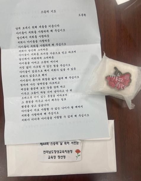 Áø¿øµ¿ÃʵîÇб³ ¹Ú±ºÀÓ ±³Àå¼±»ý´ÔÀº ¡®±³À°Àå´ÔÀÌ º¸³»Áֽнº½ÂÀÇ ³¯ ÃàÇÏ ¸Þ½ÃÁö¿Í µµÁ¾È¯ ½ÃÀÎÀÇ ¡®½º½ÂÀÇ ±âµµ¡¯¸¦ ÇÔ²² °øÀ¯ÇÏ¸ç ¿ì¸® ¾ÆÀ̵éÀ» ´õ¿í »ç¶ûÀ¸·Î ÁöµµÇϰíÀÚ ´ÙÁüÇß´Ù¡¯°í ÀüÇß´Ù.