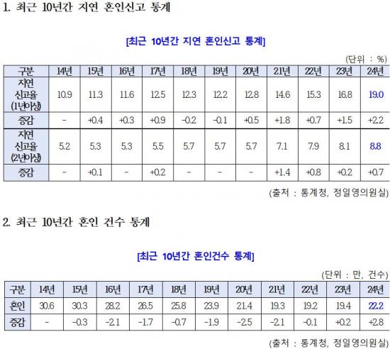 ±¹È¸ ±âȹÀçÁ¤À§¿øÈ¸ ¼Ò¼Ó ´õºÒ¾î¹ÎÁÖ´ç Á¤ÀÏ¿µ ÀÇ¿ø(ÀÎõ ¿¬¼öÀ»)ÀÌ Åë°èûÀ¸·ÎºÎÅÍ Á¦Ãâ¹ÞÀº ÀÚ·á¿¡ µû¸£¸é, ÃÖ±Ù 10³â°£ 1³â ÀÌ»ó È¥ÀÎ½Å°í°¡ Áö¿¬µÈ °Ç¼ö´Â 10.9%(2014³â)¿¡¼ 19.0%(2024³â)·Î ±ÞÁõÇß´Ù. 2³â ÀÌ»ó Áö¿¬µÈ »ç·Êµµ °°Àº ±â°£ 5.2%¿¡¼ 8.8%·Î È®´ëµÆ´Ù. È¥ÀÎ °Ç¼ö ÀÚüµµ 2014³â 30.6¸¸ °Ç¿¡¼ 2024³â 22.2¸¸ °ÇÀ¸·Î 8.4¸¸ °Ç °¨¼ÒÇÏ¸ç ¡®°áÈ¥ ±âÇÇ Çö»ó¡¯ÀÌ Áö¼ÓµÇ°í ÀÖ´Ù.