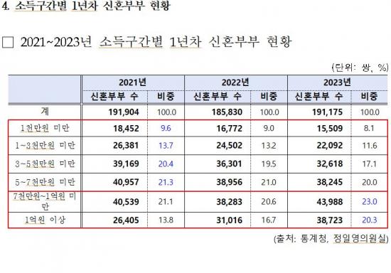ÇÑÆí, ¿¬¼Òµæ 1¾ï ¿ø ÀÌ»ó ½ÅÈ¥ºÎºÎ ºñÁßÀº 2021³â 13.8% ¡æ 2023³â 20.3%·Î ±ÞÁõÇß´Ù. 5õ~7õ¸¸ ¿ø ¹Ì¸¸ ¼Òµæ ±¸°£ÀÇ ½ÅÈ¥ºÎºÎ ºñÁßÀº °°Àº ±â°£ 21.3%¿¡¼ 20.0%·Î °¨¼ÒÇØ, ½ÅÈ¥ºÎºÎ ³» ¼Òµæ ¾ç±ØÈ°¡ ½Éȵǰí ÀÖ´Ù.