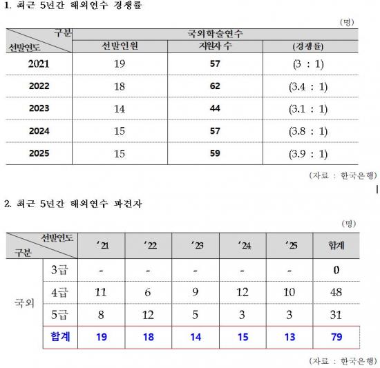 Çѱ¹ÀºÇàÀº ¸Å³â ¾à 15¸íÀ» ¼±¹ßÇØ ÇØ¿Ü MBA¡¤¼®¹Ú»ç °úÁ¤ ¿¬¼ö¿¡ µî·Ï±Ý¡¤Ã¼Àçºñ¡¤Ç×°øºñ¸¦ Àü¾× Áö¿øÇÏ°í ¿ù±Þ±îÁö Áö±ÞÇϰí ÀÖ´Ù. ÃÖ±Ù 5³â°£(2021~2025³â) ÃÑ 79¸í¿¡°Ô 77¾ï 1,800¸¸ ¿øÀÌ Áö¿øµÇ¾úÀ¸³ª, ÀÌ °¡¿îµ¥ 9¸í(11.4%)ÀÌ Á¶±â Åð»çÇÑ °ÍÀ¸·Î ³ªÅ¸³µ´Ù.