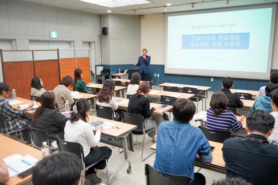 À̳¯ °ÀÇ´Â ÇѰܷ¹½Å¹® ¡®¼¿ï&¡¯ ¼½¼Ç ÆíÁýÀå ÇϺ¯±æ ±âÀÚ°¡ ¸Ã¾Æ ¡®´Ü½ÅÀ» ³Ñ¾î¼¾ß ÀÚÄ¡°¡ »ê´Ù¡¯¸¦ ÁÖÁ¦·Î 2½Ã°£ µ¿¾È ÁøÇàµÆ´Ù. ÇÏ ±âÀÚ´Â º¸µµÀÚ·áÀÇ ±â»çÈ °¡Ä¡¿Í ±âȹ·Â, ±âÀÚµéÀÌ ÁÖ¸ñÇÏ´Â ÀÚ·á ±¸¼º, Á¦¸ñ°ú ¸®µå¹® ÀÛ¼º ¿ä·É, »çÁø¡¤Ä¸¼Ç ÀÛ¼º ½Ç¹« µîÀ» ±¸Ã¼ÀûÀÎ »ç·Ê¸¦ ÅëÇØ ¼³¸íÇß´Ù.