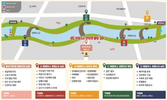 °È±â ÄÚ½º´Â ¿µµ¿5±³ ³²´Ü¿¡¼ Ãâ¹ßÇØ ¿µµ¿3±³¿Í źõ ÇÕ¼öºÎ ¹æÇ⠵Π°æ·Î·Î ³ª´µ¸ç, ¹ÝȯÁ¡À» µ¹¾Æ ´Ù½Ã Ãâ¹ßÁö·Î µ¹¾Æ¿À´Â ¹æ½ÄÀÌ´Ù. Âü°¡ÀÚ´Â ÄÚ½º °÷°÷¿¡ ¼³Ä¡µÈ 4°÷ÀÇ °Ç° üÇè ºÎ½º¸¦ ¹æ¹®Çϸç 6°³ÀÇ °Ç° ½ºÅÆÇÁ¸¦ ¹ÞÀ» ¼ö ÀÖ°í, ¿ÏÁÖÀÚ¿¡°Ô´Â Àμ¾Æ¼ºê¸¦ Á¦°øÇÑ´Ù.