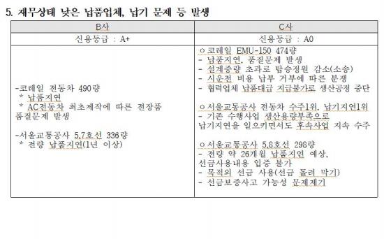 ¶Ç ´Ù¸¥ ¹®Á¦´Â ÀÌ °°Àº ºÎ½Ç Æò°¡ÀÇ °á°ú, °ø°ø»ç¾÷ ³³Ç° Â÷ÁúÀÌ ÀÕµû¸£°í ÀÖ´Ù´Â Á¡ÀÌ´Ù. ¾Õ¼ ¾ð±ÞµÈ B»ç´Â ÄÚ·¹ÀÏ Àüµ¿Â÷ 490·®À» Á¦¶§ ³³Ç°ÇÏÁö ¸øÇßÀ¸¸ç, ¼¿ï±³Åë°ø»ç Àüµ¿Â÷ 336·®Àº 1³â ³Ñ°Ô ¹Ì³³µÈ »óÅ´Ù. ¶Ç, ´Ù¸¥ C»ç´Â EMU-150 Àüµ¿Â÷ 474·® ³³Ç°ÀÌ Áö¿¬µÅ ¹ýÀû ºÐÀïÀ¸·Î À̾îÁ³°í, ¼±±Ý »ç¿ë ³»¿ªµµ ºÒÅõ¸íÇØ °¨»ç°¡ ÁøÇà ÁßÀÎ °ÍÀ¸·Î ¾Ë·ÁÁ³´Ù.