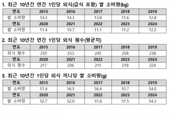 °ú°Å 10³â°£ Åë°è¿¡ µû¸£¸é ¿Ü½Ä ½Ò ¼Òºñ·®Àº 2015³â 14.3kg¿¡¼ 2024³â 12.2kg·Î °¨¼ÒÇßÁö¸¸, ½ÇÁ¦ ½Ä»ýȰ º¯È¿Í´Â ¹«°üÇÏ°Ô Á¶»ç »ê½Ä ÀÚü°¡ º¯ÇÏÁö ¾Ê¾Æ Åë°è ¿Ö°î °¡´É¼ºÀÌ ³ô´Ù´Â ÁöÀûÀÌ´Ù.