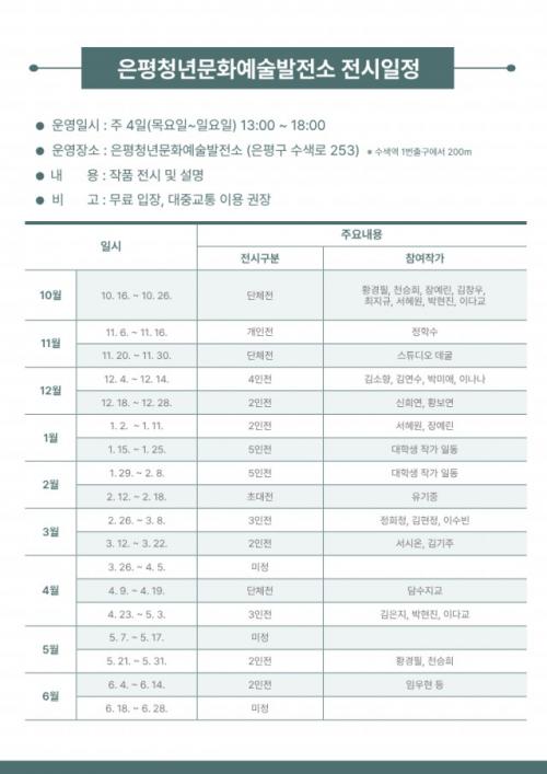 Àü½Ã´Â ÀºÆòû³â¹®È¿¹¼ú¹ßÀü¼Ò¿¡¼ ¸ÅÁÖ ¸ñ¿äÀϺÎÅÍ ÀÏ¿äÀÏ, ¿ÀÈÄ 1½ÃºÎÅÍ 6½Ã±îÁö ÁøÇàµÇ¸ç, ¹æ¹®°´µéÀº ´©±¸³ª ÀÚÀ¯·Ó°Ô °ü¶÷ÇÒ ¼ö ÀÖ´Ù. ƯÈ÷ ¸Å´Þ 2~3ȸ Àü½Ãȸ°¡ º¯°æµÅ »õ·Î¿î ÀÛǰµéÀÌ °è¼ÓÇØ¼ ¼±º¸ÀÏ ¿¹Á¤ÀÌ´Ï, ÀºÆò±¸¹ÎµéÀÇ ¸¹Àº °ü½É°ú ¹æ¹®À» ¹Ù¶õ´Ù.