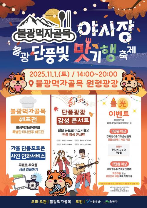 À̹ø Çà»ç´Â ¼¿ï½Ã ¡®2025³â ÀüÅë½ÃÀå ¾ß°£ ¹× À½½Ä¹®È Ȱ¼ºÈ Áö¿ø»ç¾÷¡¯À¸·Î ¼±Á¤µÅ ºÏÇÑ»ê ´ÜdzÀÌ ÀýÁ¤¿¡ À̸£´Â °¡À» Á¤Ãë ¼Ó¿¡¼ ¿¸°´Ù. ºÏÇÑ»ê µî»ê°´°ú Àα٠ÁֹΠ´©±¸³ª ¹«·á·Î Âü¿©ÇÒ ¼ö ÀÖÀ¸¸ç, »óÁ¡°¡°¡ ÁÖµµÇØ ÁÖ¹ÎÀÌ ÇÔ²² Áñ±â´Â ¡®Âü¿©Çü °ñ¸ñÃàÁ¦¡¯·Î ²Ù¸çÁø´Ù.