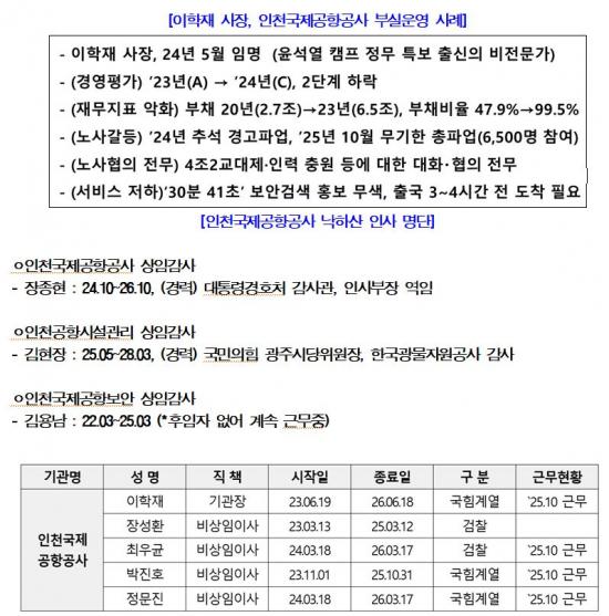 ÇÑÆí, Á¤ ÀÇ¿øÀº ¡°°øÇ×°ø»ç º»»ç »çÀå, °¨»ç»Ó ¾Æ´Ï¶ó »êÇÏ ÀÚȸ»ç¿¡µµ Á¤Ä¡±Ç¡¤º¸Àº Àλ簡 ÀÕµû¶ó ³»Á¤µÇ¸ç ³»ºÎ ¹Ý¹ßÀÌ °Å¼¼´Ù¡±°í ¹àÇû´Ù. ½ÇÁ¦·Î ÀÎõ°øÇ׽ü³°ü¸®, ÀÎõ°øÇ׺¸¾È, ÀÎõ°øÇ׿¡³ÊÁö µî ÁÖ¿ä ÀÚȸ»ç¿¡ ±¹¹ÎÀÇÈû Ãâ½Å ȤÀº ´ëÅë·É½Ç ÀλçµéÀÌ ÀÓ¸í¡¤³»Á¤µÇ¾î Àü¹®¼ºÀÌ ¾ø°í ³«ÇÏ»êÀ̶ó´Â ³í¶õÀÌ À̾îÁö°í ÀÖ´Ù.