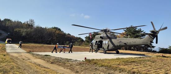 ¡Û À̹ø ÈÆ·ÃÀº ºÏÁ¢°æ µµ¼Áö¿ªÀÎ ±³µ¿¿¡¼ ÀÀ±ÞȯÀÚ ¹ß»ý ½Ã, ±º»çÅëÁ¦±¸¿ªÀ¸·Î ÀÎÇÑ ºñÇàÁ¦ÇÑ µîÀ¸·Î ¼Ò¹æÇ×°ø´ë Çï±â Ã⵿ÀÌ ¾î·Á¿î »óȲÀ» °¡Á¤Çϰí, ±º ¸Þµð¿Â Çï±â¸¦ ±ä±Þ ÅõÀÔÇØ ȯÀÚ¸¦ À̼ÛÇÏ´Â ½ÇÁ¦ »óȲ Áß½ÉÀÇ ÇÕµ¿ÈÆ·ÃÀ¸·Î ÁøÇàµÆ´Ù.