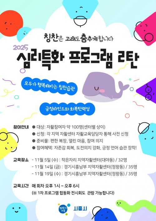 À̹ø ÇÁ·Î±×·¥Àº 5ÀÏÀ» ½ÃÀÛÀ¸·Î 14ÀÏ, 19ÀϱîÁö ÃÑ 3ȸ¿¡ °ÉÃÄ ÁøÇàµÇ¸ç, ȸÂ÷´ç ¾à 34¸íÀÇ ÀÚȰÂü¿©ÀÚ°¡ ÇÔ²²ÇÑ´Ù. ±³À°Àº ´ë¾ßµ¿°ú Á¤¿Õµ¿¿¡ ÀÖ´Â »çȸÀûÇùµ¿Á¶ÇÕ ÀÛÀºÀÚ¸®Áö¿ªÀÚȰ¼¾ÅÍ¿Í °æ±â½ÃÈï³²ºÎ Áö¿ªÀÚȰ¼¾ÅÍ ±³À°Àå¿¡¼ °¢°¢ ÃßÁøµÈ´Ù.