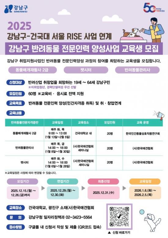 ±³À° °úÁ¤Àº µ¿¹°¸Å°³ÀçȰ»ç 2±Þ, ¹Ý·Áµ¿¹°°ü¸®»ç, Æê½ÃÅÍ µî 3°³ °úÁ¤ÀÌ´Ù. ±³À° ´ë»óÀº ¸¸ 19¼¼ ÀÌ»ó 64¼¼ ÀÌÇÏ °³²±¸ °ÅÁÖÀÚÀ̸ç, °¢ °úÁ¤´ç 20¸í¾¿ ÃÑ 60¸íÀ» ¼±¹ßÇÑ´Ù. ±³À°Àº °Ç±¹´ëÇб³°¡ ¸Ã°í, ¼¿ïÇü ¶óÀÌÁî(RISE) »ç¾÷°ú ¿¬°èÇØ ÁøÇàÇÑ´Ù.
