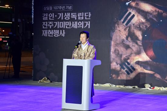 [½Åµ¿¾Æ¹æ¼Û °æ³²ÁøÁÖ=±è¸í¼ö±âÀÚ] 3.1¿îµ¿ 107ÁÖ³âÀ» ±â³äÇØ Áö³ 13ÀÏ ¿ÀÈÄ 6½Ã 30ºÐ ÁøÁÖ´ëø ¿ª»ç°ø¿ø È£±¹¸¶·ç¿¡¼ ¡®ÁøÁÖ°ÉÀΡ¤±â»ýµ¶¸³´Ü ¸¸¼¼¿îµ¿¡¯ ÀçÇö Çà»ç°¡ ¿·È´Ù.