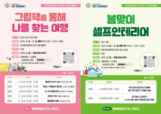 µ¿µ¿¹è¿òÅÍ´Â ÁֹεéÀÌ ÀÏ»ó ¼Ó °¡±î¿î °÷¿¡¼ ½±°í Æí¸®ÇÏ°Ô Æò»ý±³À°¿¡ Âü¿©ÇÒ ¼ö ÀÖµµ·Ï Áö¿øÇÏ´Â »ýȰ¹ÐÂøÇü ÇнÀ »ç¾÷ÀÌ´Ù. ½Ã´Â Áö³ 2¿ù µ¿º° Ư¼ºÀ» ¹Ý¿µÇÑ ÇÁ·Î±×·¥ ¿î¿µÀ» À§ÇØ °ü³» 20°³ µ¿ ÁÖ¹ÎÀÚġȸ¸¦ ´ë»óÀ¸·Î ¸ðÁýÇØ 9°³ µ¿, 16°³ ÇÁ·Î±×·¥À» ¼±Á¤Çß´Ù.